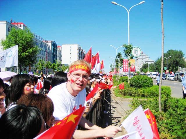 “同一個世界,同一個夢想?!蔽倚M饨藺ndrew(中文名樸安祖,簡稱安祖)來自澳大利亞悉尼,2007年8月在鶴城開始了他的中國之旅。按照外教值教一年以后可回國的原則,安祖在今年7月初就可以回國了。但為了親眼觀看圣火在鶴城的傳遞,他推遲了歸期。13日早上6時許,安祖和幾個中國朋友就來到了齊大東區(qū)迎接火炬的到來。他身著奧運T恤,手拿中國國旗與奧運會會旗,額上系著“中國加油”的小條幅,在觀眾中揮旗吶喊,并時不時用英語和流利的漢語說出“Good luck China !”“中國加油、奧運加油!”