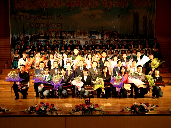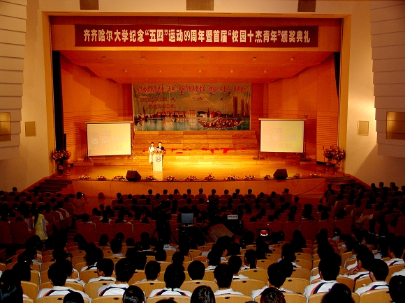 4月29日下午14時30分,我校紀念“五四”運動89周年暨首屆“校園十杰青年”頒獎典禮在音樂廳隆重召開。我校領導唱江華、史鐵成、王鳳琴、張學軍、姜守訓、張忠恒、鄭喜群、呂曉輝,共青團齊齊哈爾市委副書記那君喆,我校優(yōu)秀教師代表及學校各職能部門、各學院領導和基層團委書記、首屆“校園十杰青年”評委會成員等出席大會,我校千余名師生代表參加了此次大會,會場外還有兩千多名同學通過校園網觀看了頒獎典禮的實況直播。