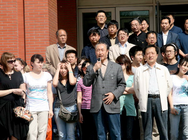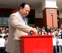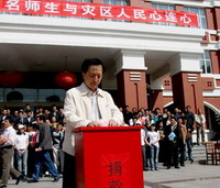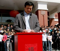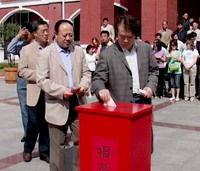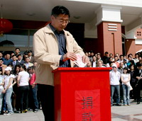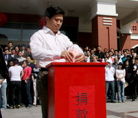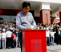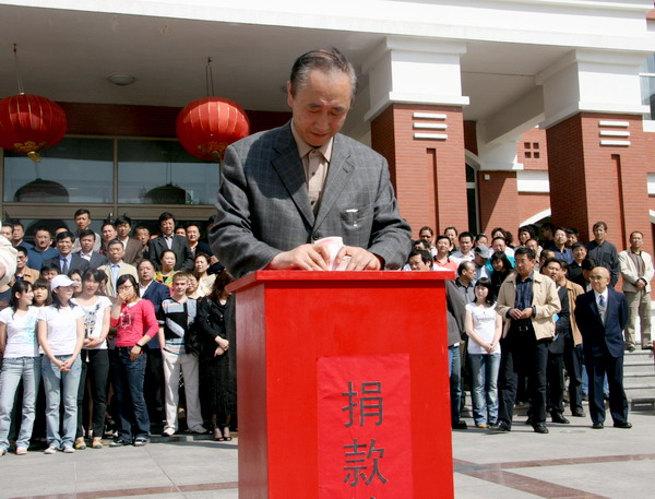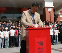 校長(zhǎng)唱江華在捐款儀式上代表學(xué)校黨委和行政向全校師生發(fā)出號(hào)召:“讓我們心系災(zāi)區(qū),奉獻(xiàn)愛(ài)心,期望災(zāi)區(qū)人民在黨中央的堅(jiān)強(qiáng)領(lǐng)導(dǎo)下早日重建家園!”
