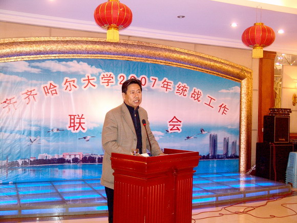 接下來(lái),市政協(xié)副主席、市委統(tǒng)戰(zhàn)部部長(zhǎng)李有彬在聯(lián)誼會(huì)以上致詞。他代表市委統(tǒng)戰(zhàn)部對(duì)我校一年來(lái)的統(tǒng)戰(zhàn)工作給予了充分肯定,并對(duì)我校今后的統(tǒng)戰(zhàn)工作提出了殷切地希望和要求,衷心祝愿齊齊哈爾大學(xué)的明天更加美好。