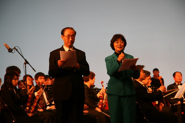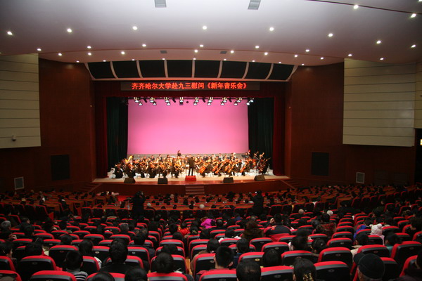 當(dāng)晚七時(shí),新年音樂會(huì)在九三分局新落成的活動(dòng)中心劇場(chǎng)進(jìn)行,千余名來自九三分局各界的觀眾觀看了交響樂團(tuán)的精彩演出。我校交響樂團(tuán)的演職人員不顧長(zhǎng)途奔波的勞頓,以極大的熱情為九三人民獻(xiàn)上了一臺(tái)高水平的音樂會(huì)。演出中間,高蓓副廳長(zhǎng)與唱江華校長(zhǎng)一起登臺(tái)朗誦了即興創(chuàng)作的抒情詩(shī),高蓓副廳長(zhǎng)在交響樂團(tuán)伴奏下傾情演唱了一首《北大荒人的歌》將晚會(huì)的氣氛推向高潮。
