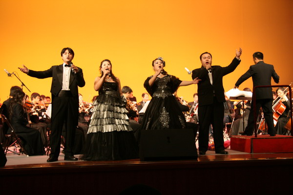 我校交響樂團(tuán)以氣勢(shì)恢宏的《紅旗頌》作為開篇,先后演奏了《蘇三組曲》、《卡門序曲》等經(jīng)典樂曲,副校長(zhǎng)鄧啟剛與藝術(shù)學(xué)院高淼、殷進(jìn)良、朱艷彬等八位青年教師分別演唱了《我像雪花天上來》、《喀什噶爾女郎》、《節(jié)日歡歌》、《祖國(guó),為你干杯》、《我的太陽》等中外名曲。精彩的演奏和演唱贏得了現(xiàn)場(chǎng)觀眾的熱烈掌聲,一位88年畢業(yè)于我校的校友激動(dòng)地說,我非常喜歡交響樂,但從沒現(xiàn)場(chǎng)感受過這種氣氛,九三局地處偏遠(yuǎn),以前從來沒有交響樂團(tuán)來過,今天母校的交響樂團(tuán)能來這里演出,我感到很激動(dòng)也很自豪。
