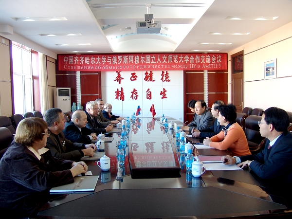 校長(zhǎng)唱江華首先對(duì)尼基金?亞歷山大副校長(zhǎng)一行的來(lái)訪表示熱烈的歡迎,對(duì)他們給予我校的關(guān)注與支持表示誠(chéng)摯的感謝,對(duì)兩校之間開(kāi)展教育教學(xué)合作所取得的成績(jī)表示高興。他向來(lái)賓詳細(xì)介紹了我校對(duì)外教育教學(xué)工作的開(kāi)展情況。唱校長(zhǎng)說(shuō),阿穆?tīng)枃?guó)立人文師范大學(xué)是一所有著深厚人文底蘊(yùn)的大學(xué),兩校之間在留學(xué)生教育、師資交流、科研合作等方面具有廣泛的合作前景,希望通過(guò)雙方共同的努力,不斷促進(jìn)雙方友好合作的深入開(kāi)展。