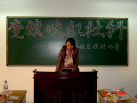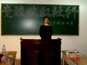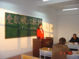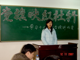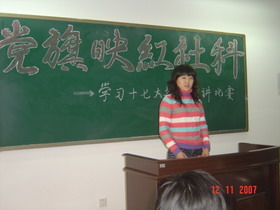 社科部非黨的碩士研究生登臺演講。演講者緊緊圍繞黨的十七大報告并結(jié)合實際,暢談了學(xué)習(xí)十七大精神的體會和心得,表達(dá)了社科部研究生學(xué)子們心向黨、熱愛黨的心聲。