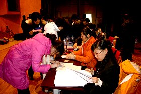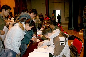 12月5日,我校2008屆畢業(yè)生供需雙選會(huì)在西區(qū)體育館隆重召開(kāi)。來(lái)自國(guó)內(nèi)10余個(gè)省市的172家企事業(yè)用人單位駐場(chǎng)參會(huì)。包括我校畢業(yè)生及部分非畢業(yè)生在內(nèi)的六千余人次入場(chǎng)參加了雙選會(huì)。副校長(zhǎng)姜守訓(xùn)出席大會(huì)現(xiàn)場(chǎng),學(xué)生指導(dǎo)中心主任李迎春、副主任吳剛、以及各學(xué)院負(fù)責(zé)學(xué)生工作的副書(shū)記副院長(zhǎng)、負(fù)責(zé)學(xué)生就業(yè)工作的輔導(dǎo)員、校學(xué)生指導(dǎo)中心的工作人員等一直在大會(huì)現(xiàn)場(chǎng)。校辦、教務(wù)處、保衛(wèi)處、網(wǎng)絡(luò)信息中心、新聞中心、體育館等相關(guān)單位各司其職,為大會(huì)做好各項(xiàng)服務(wù)工作。