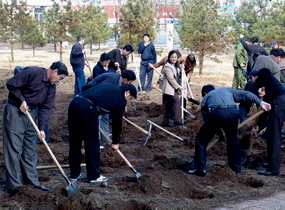春季時(shí),自施工隊(duì)伍進(jìn)入綠化工地現(xiàn)場(chǎng),后勤處就指派專人對(duì)工程質(zhì)量進(jìn)行監(jiān)督管理。他們派專人到苗源地遴選優(yōu)質(zhì)樹(shù)種,全程進(jìn)行跟蹤問(wèn)效,施工現(xiàn)場(chǎng)做到了一天一清,確保了植樹(shù)綠化的質(zhì)量。