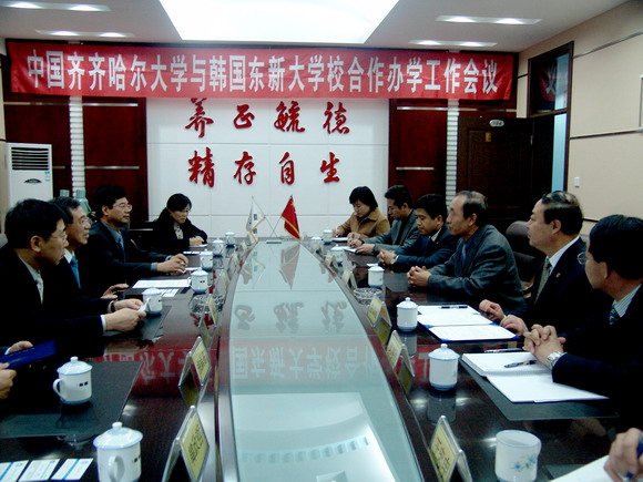 鄭奇彥總長表示,在廣闊的大平原上,在美麗的勞動湖畔,有這樣一所高水平的大學,使人感到非常高興。參觀了美麗的齊大校園,讓人心情愉快。齊大人熱情友好,讓人心里很溫暖。齊齊哈大學真是到中國留學和學習漢語普通話的好地方,給他留下了非常美好而難忘的印象。他說,韓國東新大學校將進一步加強與齊大的交流與合作,為提升合作辦學水平而共同努力。