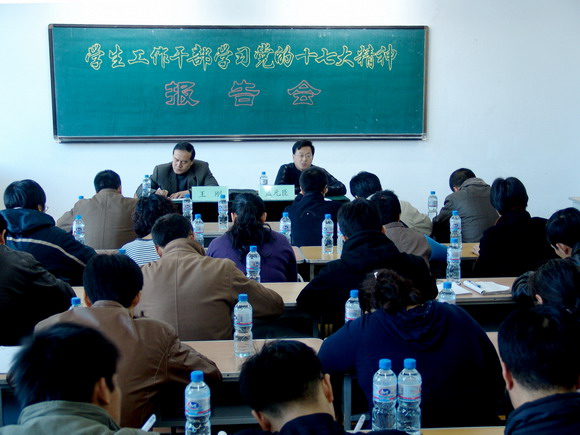 11月14日上午,為了更好地學習、宣傳、貫徹黨的十七大精神,深入落實黨的十七大提出的各項戰(zhàn)略任務,激勵廣大學生工作干部以高度的政治責任感和飽滿的工作熱情做好學生工作,學校在西區(qū)教學主樓440室召開了“學生工作干部學習黨的十七大精神輔導報告會”。