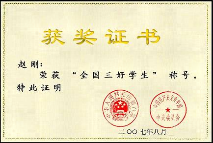 我校機械033班趙剛同學在2007年8月第九次“全國三好學生”、“全國優(yōu)秀學生干部”和“全國先進班集體”評選表彰活動中喜獲“全國三好學生”稱號。黑龍江省高校獲得“全國三好學生”和“全國優(yōu)秀學生干部”榮譽稱號的僅八人。