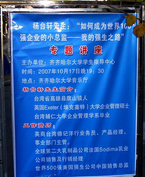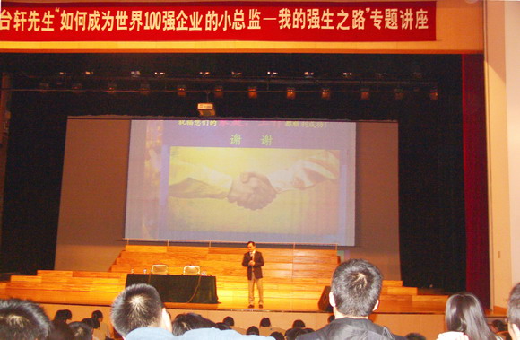 為進一步做好2008屆畢業(yè)生就業(yè)工作,全面提高廣大畢業(yè)生的就業(yè)能力, 11月17日晚,臺灣輔仁大學(xué)企業(yè)管理系畢業(yè),英國Exeter(??巳?大學(xué)企業(yè)管理碩士楊臺軒先生應(yīng)我校學(xué)生指導(dǎo)中心邀請,專程來校為2008屆畢業(yè)生作了題為“如何成為世界100強企業(yè)的職業(yè)經(jīng)理人——我的強生之路”專題講座。