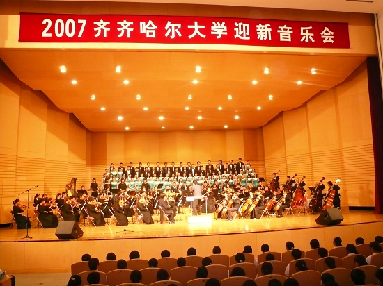 9月18日晚19時,齊齊哈爾大學(xué)迎新生音樂會第一場演出在音樂廳隆重拉開帷幕。副校長姜守訓(xùn)發(fā)表了熱情洋溢的講話。他在講話中對2007級新生考入我校表示衷心的祝賀和熱烈的歡迎,對他們在大學(xué)期間的學(xué)習(xí)、工作和生活提出了殷切的希望。在校長唱江華、副校長鄧啟剛、工會主席呂曉輝的帶領(lǐng)下,交響樂團、合唱團的演員傾情演繹了中國傳統(tǒng)名曲《梁?!芬约啊陡阕摺?、《黃河》等。整場音樂會氣氛莊重?zé)崃摇=逃c傳媒學(xué)院、國際交流學(xué)院、通信學(xué)院和計控學(xué)院的1000余名2007級學(xué)生通過欣賞本場演出,了解了交響樂知識和欣賞常識,更為精彩的演出所陶醉所折服。至此,由校團委舉辦的慶祝建國58周年“我與祖國共奮進”主題系列活動隆重啟動。