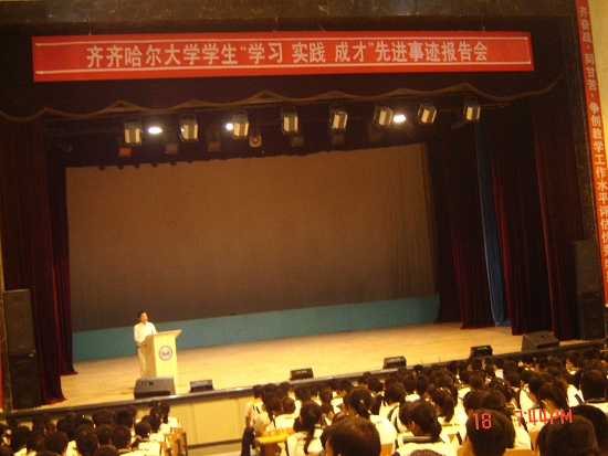 同日晚19時,齊齊哈爾大學(xué)第三期大學(xué)生“學(xué)習(xí)?實踐?成才”先進事跡報告團在中區(qū)文化宮舉辦了第一場報告會。生命學(xué)院生物科學(xué)專業(yè)044班王曉宇、人文學(xué)院中文053班陳萍、機械學(xué)院過控042班張忠誠、通信學(xué)院電子045班周思宇、輕工紡織學(xué)院紡織042班葛興嬋分別以《課外科技活動助我成長》、《生命的輝煌拒絕的不是平凡而是平庸》、《 創(chuàng)造、創(chuàng)新、創(chuàng)業(yè)鋪就成才路》、《堅定信念,展翅飛翔》、《是野草,也要作頑強堅韌的一棵》為題做了報告,匯報了自己在爭當(dāng)學(xué)習(xí)標兵、投身科技創(chuàng)新、勇于自立自強、真誠服務(wù)同學(xué)等方面的事跡。應(yīng)用技術(shù)學(xué)院、藝術(shù)學(xué)院、體育學(xué)院和生命學(xué)院的2007級學(xué)生聽取了報告會。報告團成員的事跡給2007級同學(xué)以有益的啟示和鼓舞,贏得了他們的陣陣掌聲,激勵他們沿著一代代齊大人的奮斗足跡拼搏進取、努力成才、服務(wù)社會、為校爭光。