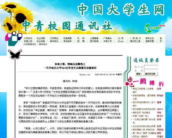 8月18日21:40,中央八家重點(diǎn)新聞宣傳網(wǎng)站之一、目前國內(nèi)最大的青少年門戶網(wǎng)站—中青網(wǎng)以《青春之歌,唱響在邊陲熱土—齊齊哈爾大學(xué)583名畢業(yè)生志愿服務(wù)邊疆基層》為醒目標(biāo)題,對(duì)我校“583名畢業(yè)生志愿服務(wù)邊疆基層著華章”的感人事跡給予了熱忱報(bào)道,現(xiàn)予轉(zhuǎn)載。
