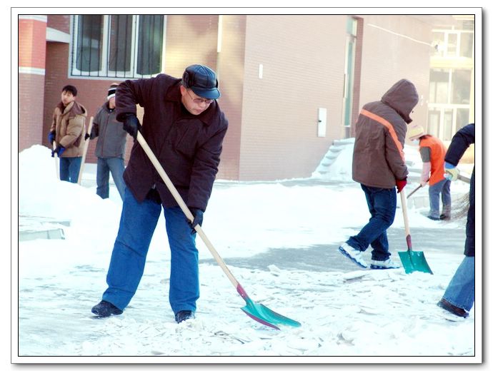 在萬人清雪大軍中,后勤處總務(wù)科科長王維亭盡管已過了知天命之年,但仍然帶領(lǐng)總務(wù)科的年輕人和廣大師生一道奮戰(zhàn)在勞動第一線,揮鍬清雪,往來運送,充分發(fā)揮著共產(chǎn)員的先鋒模范作用。