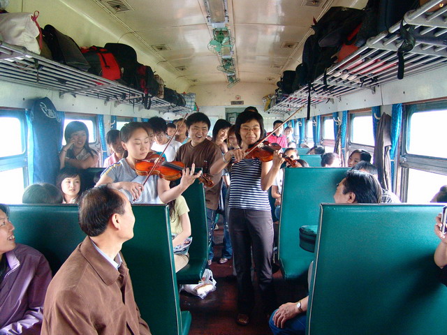 這是我校交響樂團(tuán)接受教育部指派到外地高校進(jìn)行巡回演出的第一場,全體演職人員情緒高漲,精神飽滿,車廂中充滿了歡聲笑語,樂團(tuán)的佟麗楠和徐丹還即興演奏了小提琴曲,歡快的樂曲感染了車廂里的其他乘客,一位年輕的母親也高興地抱著自己6個月大的孩子擠過來觀看。