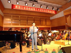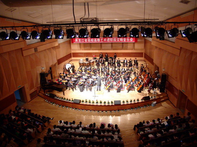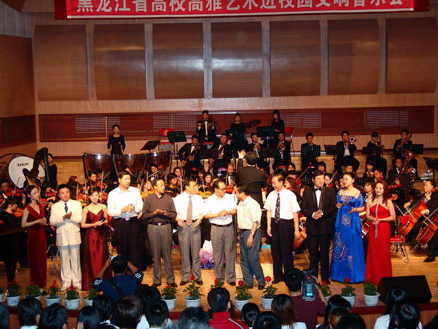 次日下午,交響樂團(tuán)在佳大音樂廳進(jìn)行了排練。18:30分,佳大音樂廳座無虛席。演出正式開始前,佳木斯大學(xué)的黨委副書記劉強(qiáng)和我校校長唱江華分別致詞。劉強(qiáng)在致詞中感謝齊齊哈爾大學(xué)為佳大校園送來了高雅的藝術(shù),唱江華在致詞中表示非常高興有機(jī)會到佳大交流和學(xué)習(xí),并祝愿佳大早日步入一流大學(xué)的行列。