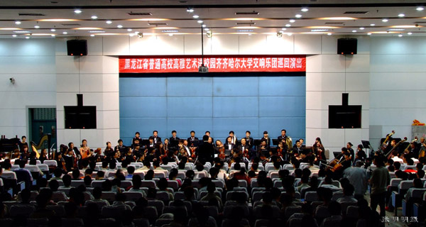6月19日,我校交響樂團赴哈爾濱理工大學(xué)演出,這是在哈高校巡演的第二站。當(dāng)日下午,哈爾濱理工大學(xué)黨委書記高軍、校長趙奇會見了校長唱江華教授。當(dāng)晚18:30分,演出在哈爾濱理工大學(xué)的報告廳進行。省教育廳文體衛(wèi)處副處長龔彥、哈爾濱理工大學(xué)黨委副書記陸鳴鵑、副校長武俊峰、團委副書記肖慶生、楊忠學(xué)及部分學(xué)院團總支書記、輔導(dǎo)員等800余名師生觀看了演出。在演出前,哈爾濱理工大學(xué)副校長武俊峰發(fā)表了熱情洋溢的講話,高度評價了高雅藝術(shù)進校園活動,介紹了我校交響樂團,并祝演出取得圓滿成功。