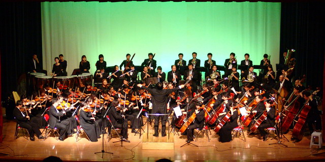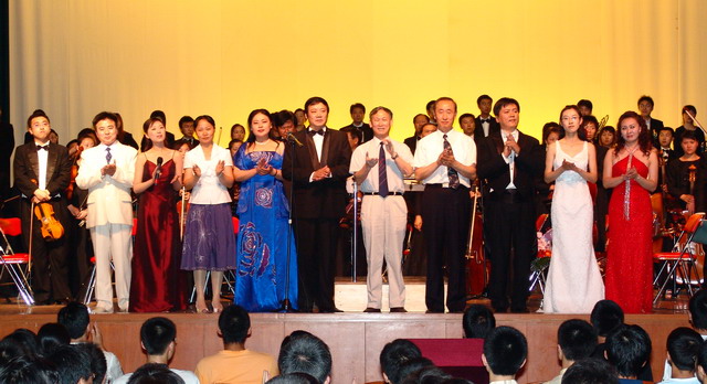 晚6:30,音樂會在交響序曲《紅旗頌》中拉開了帷幕。一曲曲優(yōu)美的旋律,贏得了現(xiàn)場觀眾陣陣掌聲,現(xiàn)場觀眾被音樂的魅力感動,被音樂的旋律引導(dǎo),被音樂的世界同化。演出在校長唱江華的一曲小提琴獨奏《梁山伯與祝英臺》選段和副校長鄧啟剛的男高音獨唱《跟你走》中達到了高潮,同學(xué)們通過贈送鮮花表達對老師表演由衷地贊美。音樂會在交響樂團演奏的《拉德斯基進行曲》和全場有節(jié)奏的掌聲中圓滿結(jié)束。全場掌聲不斷,同學(xué)們遲遲不肯離去。在掌聲中祝愿我們兩校之間的友誼地久天長,通過交流與合作為祖國培養(yǎng)更多、更優(yōu)秀的人才。