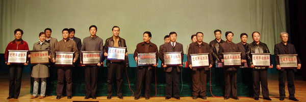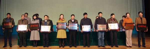在主席臺就座的學(xué)校及市文明辦領(lǐng)導(dǎo)為榮獲校級文明單位標(biāo)兵和文明單位的代表頒發(fā)了獎牌。