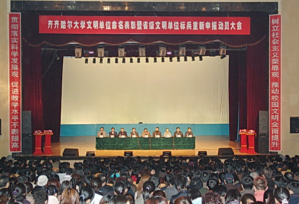 校黨委副書記史鐵成宣布了《中共齊齊哈爾大學(xué)委員會、齊齊哈爾大學(xué)關(guān)于命名表彰校級文明單位標(biāo)兵和文明單位的決定》;副校長曲偉建宣布了《齊齊哈爾大學(xué)省級文明單位標(biāo)兵迎評促建工作實施意見》。