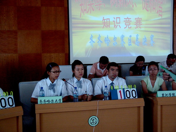 7月14日上午9:30時(shí),我省高?!爸獦s辱、樹(shù)新風(fēng)、促和諧”知識(shí)競(jìng)賽齊齊哈爾賽區(qū)現(xiàn)場(chǎng)競(jìng)賽在我校西主七樓報(bào)告廳隆重舉行。