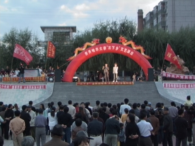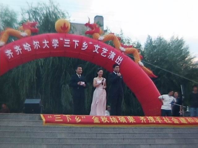 9月5日上午,社會實踐服務(wù)團師生不顧一路顛簸勞累,在到達泰來縣江橋鎮(zhèn)后即在江橋鎮(zhèn)馬占山抗日紀念公園舉行了“緬懷先烈,牢記歷史”愛國主義主題教育活動,聽取了王東升老同志的關(guān)于江橋抗戰(zhàn)革命歷史知識介紹。齊齊哈爾市關(guān)工委副主任崔文杰、察廣信、甘文耀,泰來縣縣委副書記郭宇航、副縣長馬志海、團縣委書記劉立偉、江橋鎮(zhèn)鎮(zhèn)長李洪宇等出席活動;同時,社會服務(wù)團資助了泰來縣江橋鎮(zhèn)中學(xué)5名貧困學(xué)生,為江橋鎮(zhèn)捐贈衣物600余件;開展了義診并贈送藥品。晚18:30,社會實踐服務(wù)團師生在泰來縣中心廣場開展“再攜手,共建和諧”大型廣場文藝演出。泰來縣委、縣人大、縣政府、縣政協(xié)及相關(guān)部門領(lǐng)導(dǎo)和社會各界群眾千余人觀看了精彩的文藝演出。我校大學(xué)生社會實踐服務(wù)團成員與泰來縣群眾一起同臺表演,活躍了氣氛,增進了友誼。我校學(xué)生表演的歌曲《跟黨走》、舞蹈《月光下的鳳尾竹》等精彩的文藝節(jié)目博得了現(xiàn)場的泰來縣廣大人民群眾的熱烈掌聲。熱情洋溢的掌聲,進一步激發(fā)了廣大同學(xué)更好地開展“三下鄉(xiāng)”活動的信心;人民群眾的鼓勵,更加堅定了同學(xué)們踐行“三個代表”重要思想的決心。
