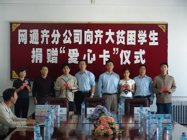 9月14日下午1時(shí),中國網(wǎng)通齊齊哈爾分公司向貧困學(xué)生捐贈"愛心卡"的儀式在我校西區(qū)主樓606會議室舉行。齊齊哈爾通信分公司副總經(jīng)理李巖、齊齊哈爾通信分公司瀏園分局局長劉松濤、副局長高宏偉、閆偉,我校學(xué)生處處長王剛、副處長吳寶柱及相關(guān)工作人員與來自各學(xué)院的30名貧困生代表參加了儀式。