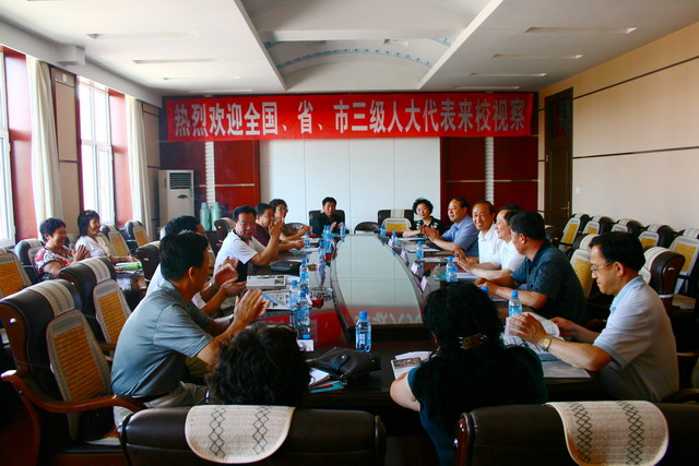 我校領(lǐng)導(dǎo)與來校的各級(jí)人大代表在機(jī)關(guān)行政樓5樓會(huì)議室進(jìn)行了座談。校長唱江華向各位代表介紹了學(xué)校的基本情況,會(huì)后代表們?cè)趯W(xué)校領(lǐng)導(dǎo)的陪同下參觀了我?;?shí)驗(yàn)室、計(jì)算中心、圖書館、網(wǎng)絡(luò)中心、體育館、游泳館等場所。