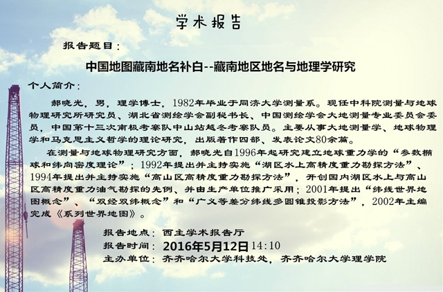 5月12日,郝曉光研究員在西區(qū)主樓學(xué)術(shù)報告廳舉行了題為《中國地圖藏南地名補白藏南地區(qū)地名與地理學(xué)研究》的學(xué)術(shù)報告。
