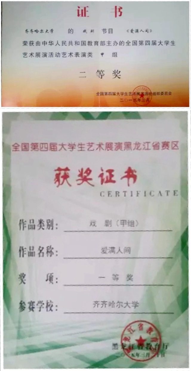 原創(chuàng)話劇《愛滿人間》曾獲得全國第四屆大學生藝術(shù)展演黑龍江省賽區(qū)戲劇類一等獎、全國第四屆大學生藝術(shù)展演活動藝術(shù)表演類二等獎。