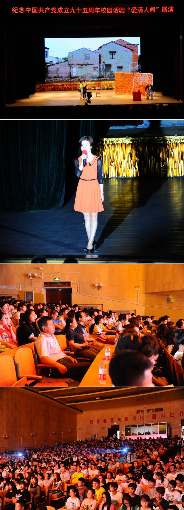 6月21日下午,紀念建黨九十五周年原創(chuàng)話劇《愛滿人間》展演在我校文化宮演出。校黨委宣傳統(tǒng)戰(zhàn)部副部長何強,教育與傳媒學院黨委書記于學江,院長李虹,院黨委副書記兼副院長袁冰巖等與千余名師生一起觀看了話劇演出。