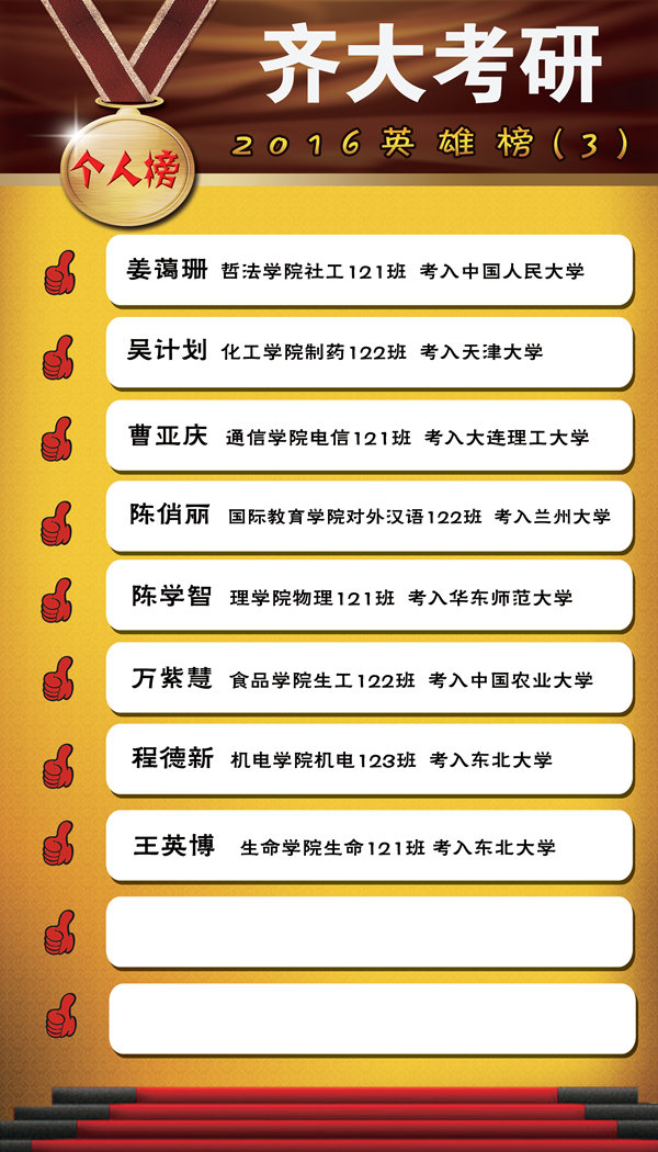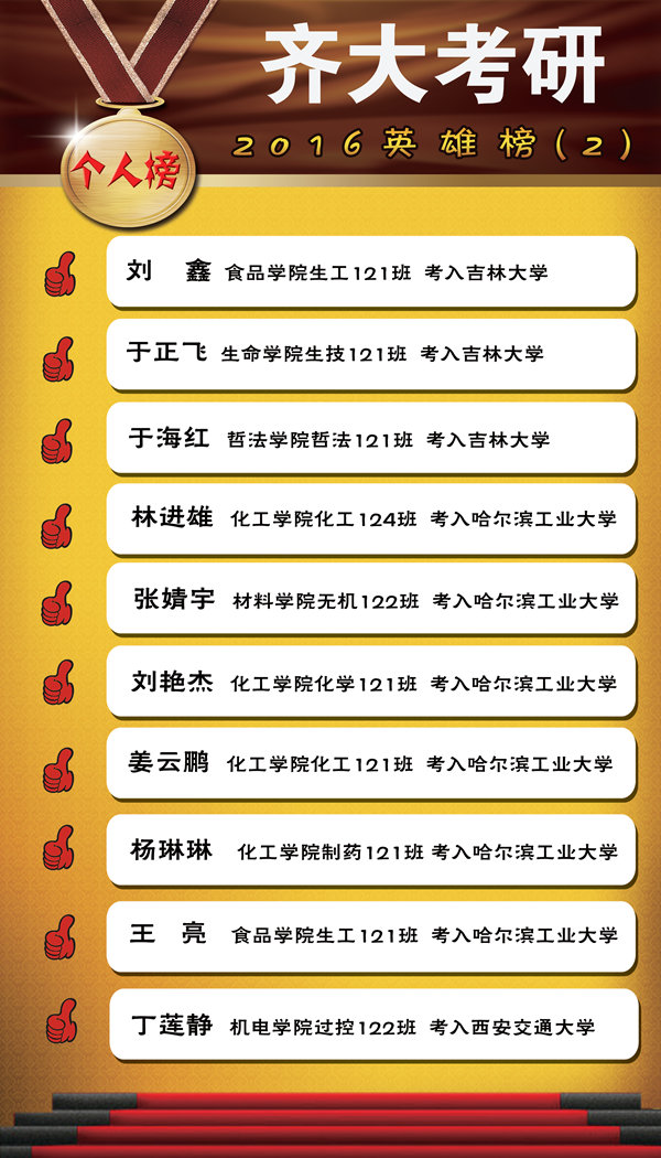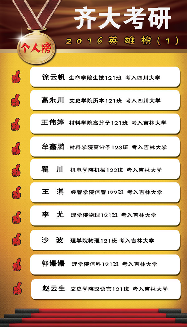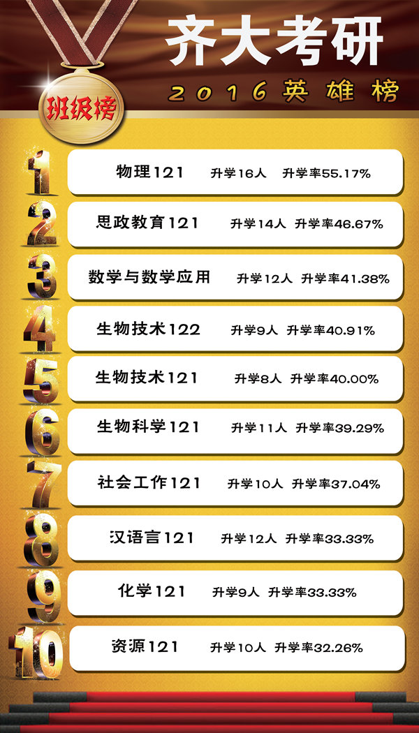 以下是2016年的學(xué)院考研率前十名、班級(jí)考研率前十名以及考入“985工程”院校的學(xué)生名單。
