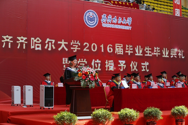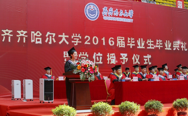 本科生代表、校學(xué)生會主席、校優(yōu)秀畢業(yè)生劉燁瑋發(fā)言。她說:“齊大留給我們許多財富,不僅有前沿的科學(xué)理論知識,更有一種對真善美的執(zhí)著信仰和由衷熱愛。在這個離別的日子,我謹(jǐn)代表2016屆全體畢業(yè)生感恩母校,感念師恩,感懷友情。此去須懷報國志,不忘春風(fēng)化雨恩。衷心祝福所有的師長萬事如意,每一位齊大學(xué)子鵬程萬里,祝愿我們的母校—齊齊哈爾大學(xué)永遠(yuǎn)年輕美麗。未來人生路上我們會將致知、致用、致遠(yuǎn)的學(xué)風(fēng)化作實際行動,永遠(yuǎn)銘記我們是心懷大愛、身容大道、明正大學(xué)的齊大人,在實現(xiàn)“中國夢”的偉大歷史進(jìn)程中貢獻(xiàn)智慧和力量!”