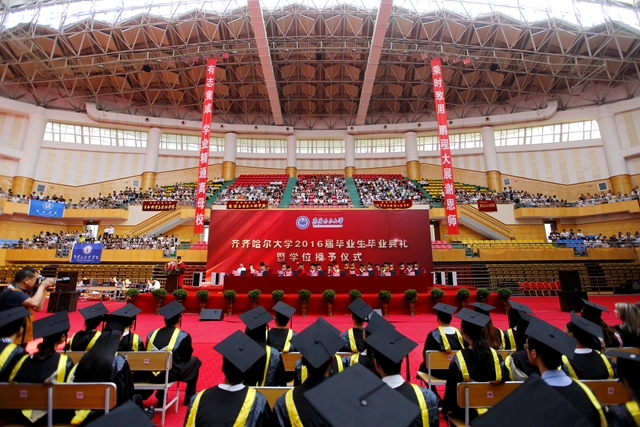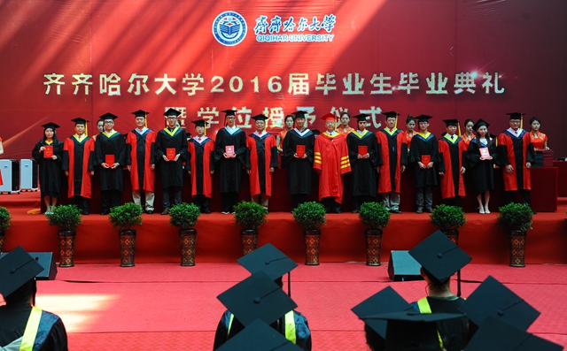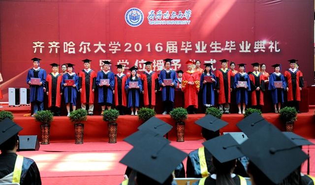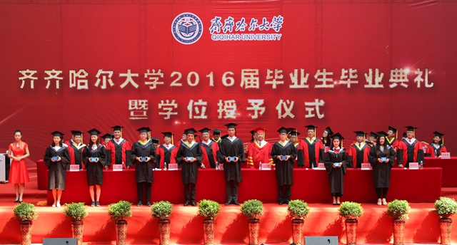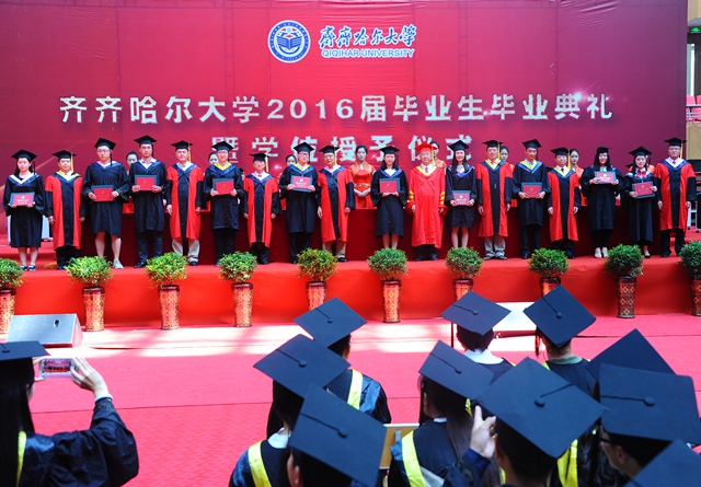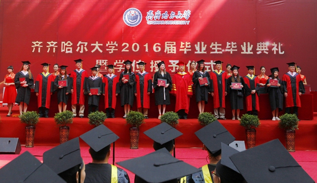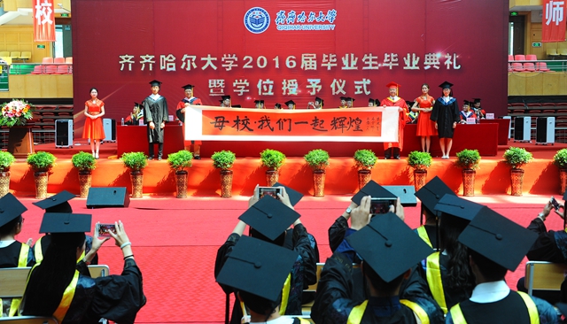 最后,全體師生起立,齊唱“歌唱祖國”?!懂厴I(yè)歌》聲中,“齊齊哈爾大學(xué)2016屆畢業(yè)生畢業(yè)典禮暨學(xué)位授予儀式”圓滿結(jié)束。