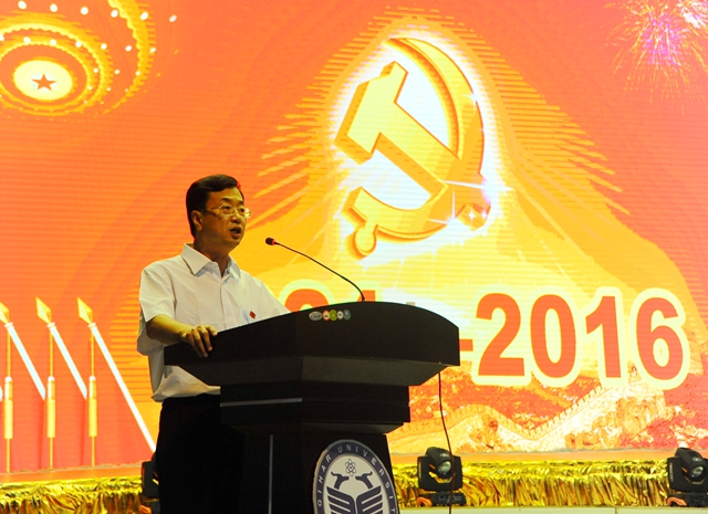 校黨委副書(shū)記蓋元臣代表學(xué)校黨委講話。他說(shuō),今天,我們隆重集會(huì),熱烈慶祝偉大的中國(guó)共產(chǎn)黨成立95周年,就是要重溫黨的光輝歷史,謳歌黨的豐功偉績(jī),堅(jiān)定永遠(yuǎn)跟黨走的信念。通過(guò)表彰近年來(lái)涌現(xiàn)的先進(jìn)基層黨組織、優(yōu)秀共產(chǎn)黨員和優(yōu)秀黨務(wù)工作者,進(jìn)一步激發(fā)我們爭(zhēng)做“四講四有”合格黨員的熱情,為推進(jìn)學(xué)校高水平大學(xué)建設(shè)事業(yè)擊鼓奮進(jìn)、再創(chuàng)佳績(jī)、再立新功!我謹(jǐn)代表學(xué)校黨委向?qū)W校各基層黨組織和勤奮工作在教學(xué)、科研、管理、服務(wù)等各條戰(zhàn)線上的全體教職工黨員,向曾經(jīng)為學(xué)校建設(shè)和發(fā)展做出貢獻(xiàn)的離退休老黨員,向勤奮學(xué)習(xí)、健康成長(zhǎng)的青年學(xué)生黨員表示節(jié)日的祝賀和誠(chéng)摯的問(wèn)候!向受到表彰的先進(jìn)黨組織和優(yōu)秀個(gè)人表示熱烈的祝賀并致以崇高的敬意!