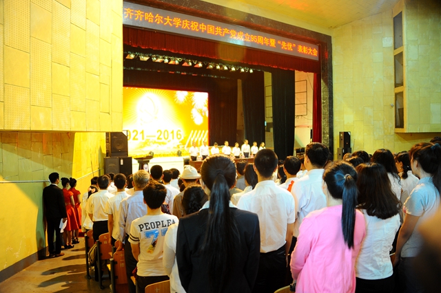 全體起立,會(huì)場(chǎng)奏國(guó)際歌。中共齊齊哈爾大學(xué)委員會(huì)慶祝中國(guó)共產(chǎn)黨成立95周年暨“先優(yōu)”表彰大會(huì)圓滿結(jié)束。
