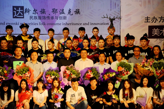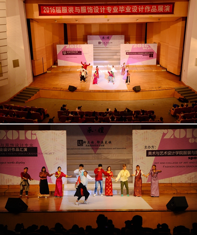 美術(shù)與藝術(shù)設(shè)計學院服裝與服飾設(shè)計專業(yè)2016屆畢業(yè)設(shè)計作品展演不僅展出了同學們自主設(shè)計、創(chuàng)作的達斡爾族、鄂溫克族等少數(shù)民族的服飾,而且還邀請了來自西藏自治區(qū)的同學們助演了藏族鍋莊舞蹈,展現(xiàn)了民族和諧一家親的感人場景。