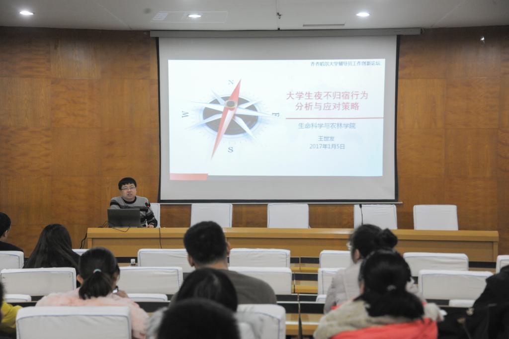 本次論壇共收到20個學(xué)院輔導(dǎo)員提交的26篇論文,為歷屆論壇收集論文數(shù)量最多,參與面最廣,質(zhì)量最高。經(jīng)遴選,理學(xué)院王玢的《輔導(dǎo)員采用教練技術(shù)提升談心談話效果》、文學(xué)與歷史文化學(xué)院景言的《校園貸存在的問題及對策探討》、經(jīng)濟(jì)與管理學(xué)院王歡歡老師的《淺析高校輔導(dǎo)員在大學(xué)生創(chuàng)新創(chuàng)業(yè)教育中的作用》、化學(xué)與化學(xué)工程學(xué)院的王歡《校園體育文化視域下大學(xué)生基礎(chǔ)文明養(yǎng)成教育研究》、生命科學(xué)與農(nóng)林學(xué)院王世發(fā)的《大學(xué)生夜不歸宿行為與應(yīng)對策略》等5篇論文在論壇上進(jìn)行了大會交流。