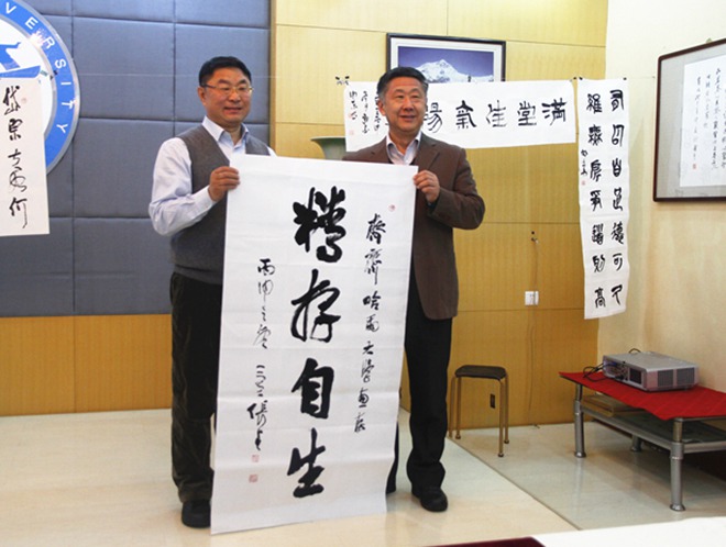 2016年12月23日,“龍江書法大講堂”走進齊齊哈爾大學(xué)活動在我校德潤大廈舉行,活動由何鑫教授主持,我校相關(guān)部門領(lǐng)導(dǎo)和市書法家協(xié)會的相關(guān)人員出席了活動,齊大師生及市書法界人士近300人參加活動,省書法家協(xié)會主席張戈應(yīng)邀為齊大師生作了題為《書法的臨摹與創(chuàng)作》講座。會后書法家一行還與我校師生舉行了座談和筆會交流,原市政協(xié)主席張貴海、市委常委、宣傳部部長李大方、市文聯(lián)主席朱宏宇以及我校領(lǐng)導(dǎo)馬立群、李英杰等出席了相關(guān)活動,張戈即興揮毫寫下了齊齊哈爾大學(xué)校訓(xùn)中的“精存自生”四個字贈送給我校校史館收藏。