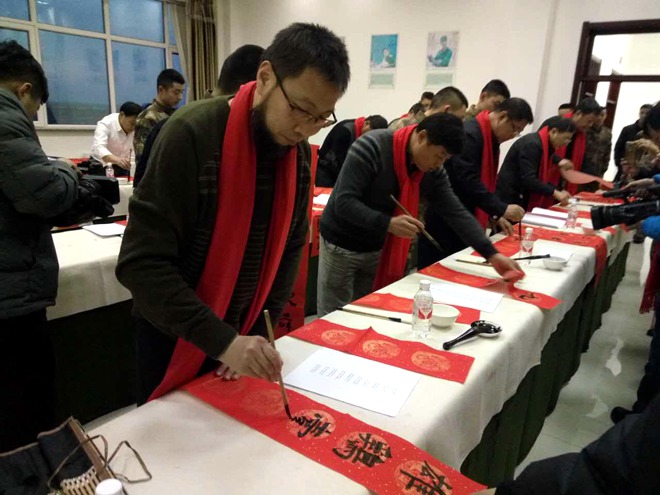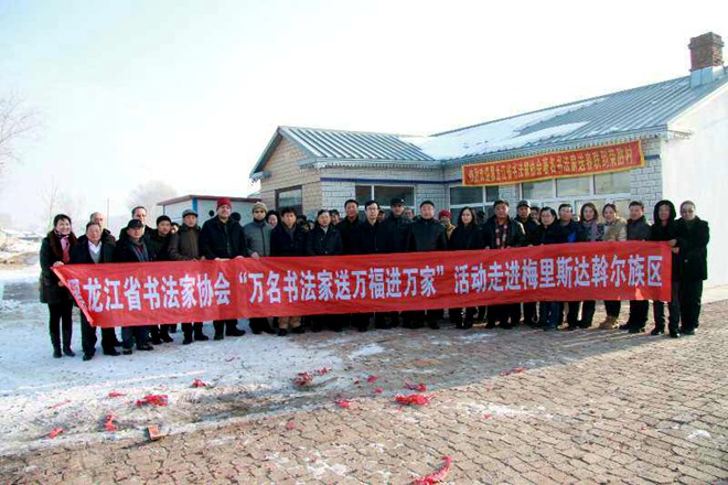 何鑫還與來自省市的書法家們一起利用雙休日到齊齊哈爾市梅里斯達斡爾族區(qū),為達鄉(xiāng)書法愛好者送來了傳統(tǒng)文化的盛宴和民族情誼的溫暖,齊齊哈爾市文聯(lián)主席朱宏宇主持了活動,張戈、胡志平、李文寶、何鑫、石正軍、宋衛(wèi)東、王大明等書法名家分別為達鄉(xiāng)書法愛好者的作品進行了現(xiàn)場點評和指導(dǎo)。隨后大家又深入到梅里斯區(qū)榮勝村開展“送萬福到萬家”活動,該村近年來已形成一個在當?shù)匦∮忻麣獾霓r(nóng)民書法群體。在農(nóng)民趙占啟家中,書法家們?yōu)猷l(xiāng)村農(nóng)民書寫了一幅又一幅滿載憧憬與祝福的春聯(lián)、福字,村民們?nèi)绔@至寶,爭相請“?!保瑘雒婊鸨瑹崃?,達鄉(xiāng)群眾也為書法家們的到來,獻上了具有濃郁民族風(fēng)情的《青青柳蒿芽》等達斡爾族歌舞,雖然時值深冬,但農(nóng)家小屋氣氛溫馨,暖意融融。