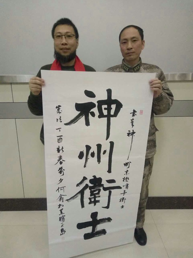 1月18日,何鑫教授隨團來到了中國的最東極--黑瞎子島。黑瞎子島位于黑龍江省撫遠市,是我國的最東端,是每天最早把太陽迎進祖國的地方,因此駐島官兵有東極哨兵的美譽,習(xí)總書記曾于2016年5月登島慰問官兵。本次活動由黑龍江省文聯(lián)黨組成員、副主席、省書法家協(xié)會主席、中國書法家協(xié)會理事張戈帶隊,中國書法家協(xié)會理事、省書法家協(xié)會駐會副主席兼秘書長胡志平、中國書協(xié)專委會委員、省書協(xié)副主席、佳木斯市書協(xié)主席李月貴、中國書協(xié)專委會委員、省書協(xié)副主席、大慶市書協(xié)主席錢松君等十余名著名書法家冒著三九嚴寒長途驅(qū)車登上黑瞎子島,能夠把書法藝術(shù)送到這里,大家都感到很自豪。書法家一行在參觀了解駐島部隊的光榮歷程及官兵生活訓(xùn)練情況之后,用重筆濃墨揮毫為戰(zhàn)士們送上了新春的祝福。何鑫教授為守衛(wèi)在中國東極黑瞎子島上的邊防哨所官兵題寫了“神州衛(wèi)士”四個大字,筆力剛健,雄渾有力,表達了對駐島邊防衛(wèi)士保家衛(wèi)國、長年戍邊的深深敬意,駐島邊防部隊某團政委曲道成鄭重地接過作品并與何鑫教授合影。