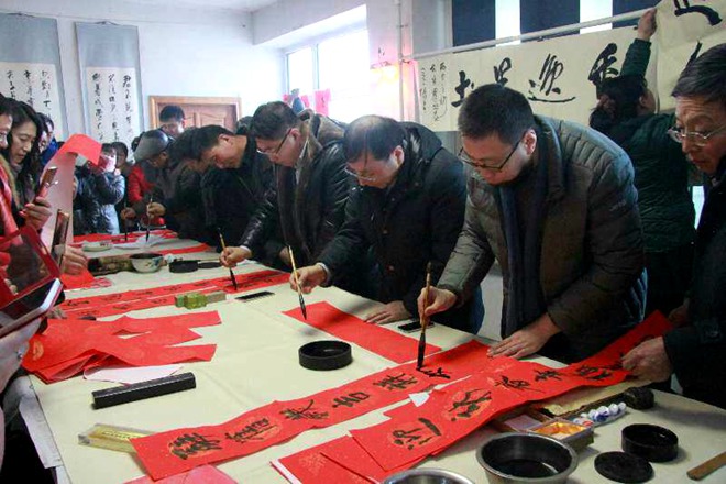 在傳統(tǒng)“小年”當天,何鑫教授及書法家慰問團成員一行來到烏蘇鎮(zhèn)抓吉赫哲族村,為身穿節(jié)日盛裝的當?shù)睾照茏宕迕袼透K痛郝?lián),村民們也向書法家們展示了獨具民族特色的赫哲魚皮手工藝品,場面熱烈,傳統(tǒng)節(jié)慶的喜悅與民族兄弟的友誼融匯在一起。張戈主席發(fā)表致辭。他表示,赫哲族是居住在黑龍江省的一個具有代表性的少數(shù)民族,我們把文藝精品送到抓吉赫哲族村,也是落實中央領(lǐng)導(dǎo)指示精神的一個實際舉措。這也是我們繼慰問齊齊哈爾市梅里斯達斡爾族區(qū)之后,書法家們來到勤勞勇敢的赫哲族村,為少數(shù)民族同胞再一次送上新春的祝福。儀式后,書法家們揮毫運筆,為少數(shù)民族朋友們書寫了一幅又一幅滿載憧憬與祝福的春聯(lián)、福字,場面十分熱烈。一位村民說:“以前我們都不懂書法,總覺得在市集上買上一副春聯(lián)也能對付。可是經(jīng)過這一次活動,才讓我深深的受到了震撼,感受了書法的魅力,我以后一定會讓我家孩子去學(xué)習(xí)書法,感謝各位書法家?!碑?shù)匾晃患丈先吮硎?,感謝書法家把大紅福字、春聯(lián)送到家門口,也讓我們記住了這難忘的一天。她還用赫哲語為全國人民送上赫哲族人民的節(jié)日祝福。