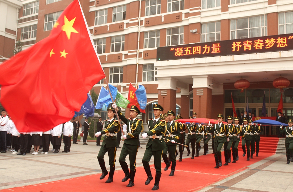 “凝五四力量,抒青春夢想”主題升旗儀式活動開始,全體肅立,出國旗、校旗,升國旗、校旗,唱國歌、校歌。