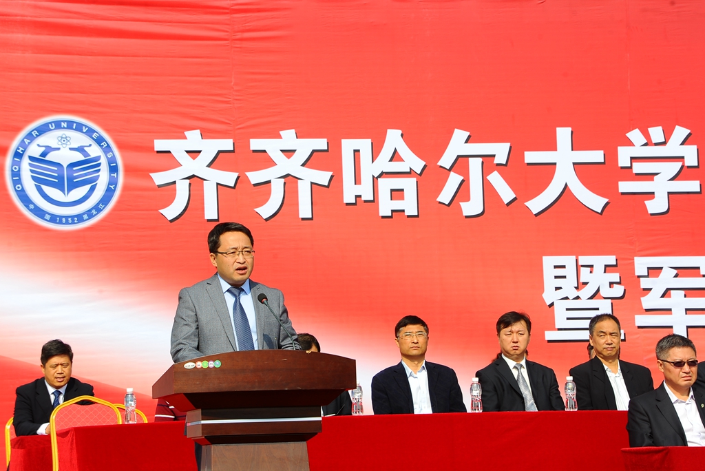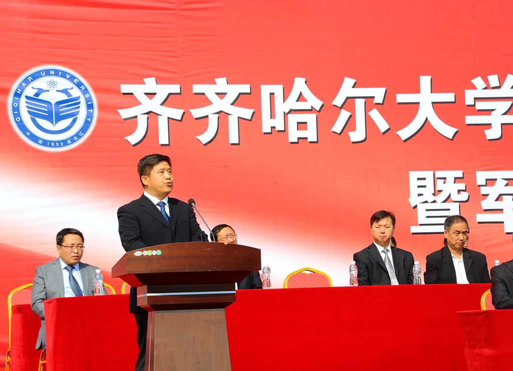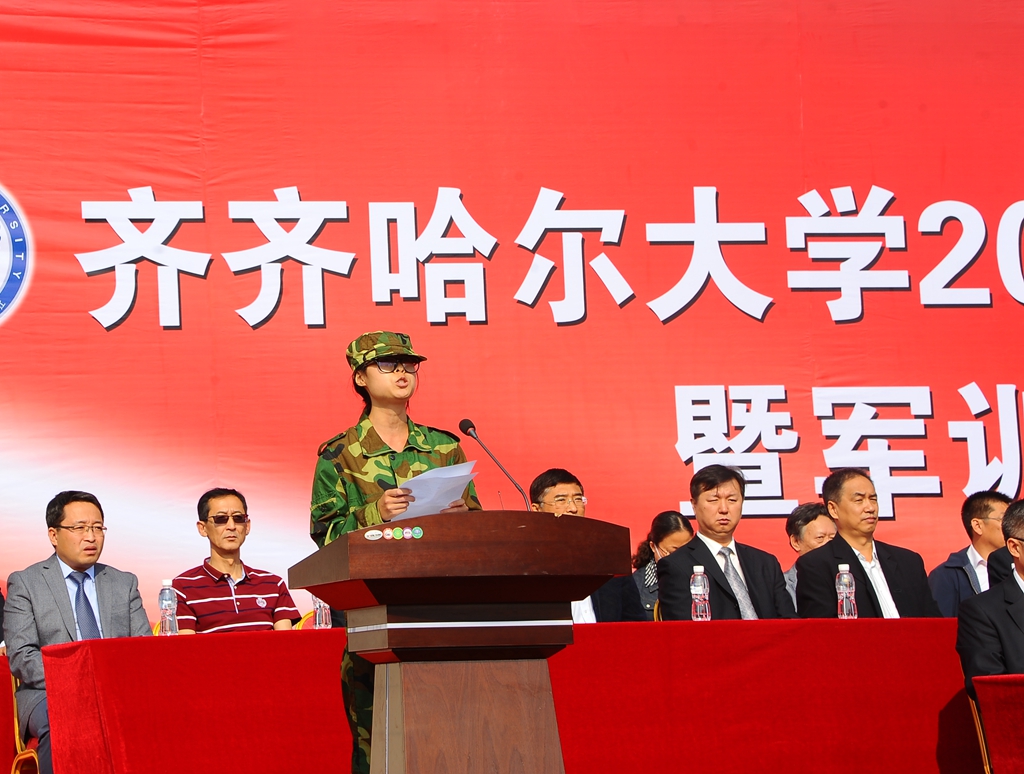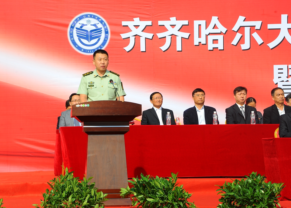 武警齊齊哈爾支隊副參謀長韓劍飛中校代表武警齊齊哈爾支隊的全體官兵對參加軍訓工作的老師、學生以及全體教官表示親切的問候!他表示,齊齊哈爾大學和武警齊齊哈爾支隊是共建單位。幾年來,我們親眼見證了齊齊哈爾大學輝煌的建設成就。齊齊哈爾大學舉行這次軍訓,是全面貫徹黨的教育方針和國防教育法、推進素質(zhì)教育的重要舉措,是同學們學習軍隊優(yōu)良傳統(tǒng)、培養(yǎng)艱苦奮斗精神的良好機會,希望同學們一定要珍惜軍訓機會,高標準、高質(zhì)量、安全順利地完成軍訓任務,超越自我,不斷前進,讓青春年華在未來的征途中放射出燦爛奪目的光彩!