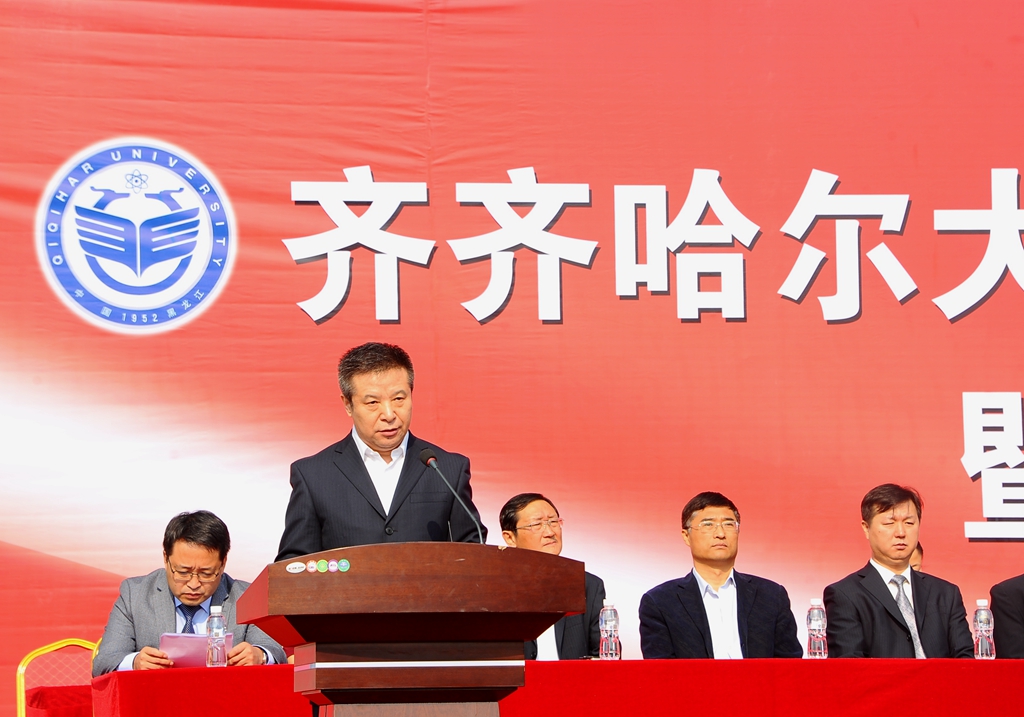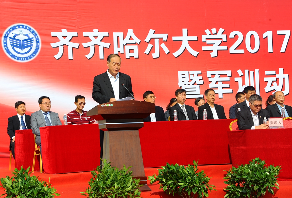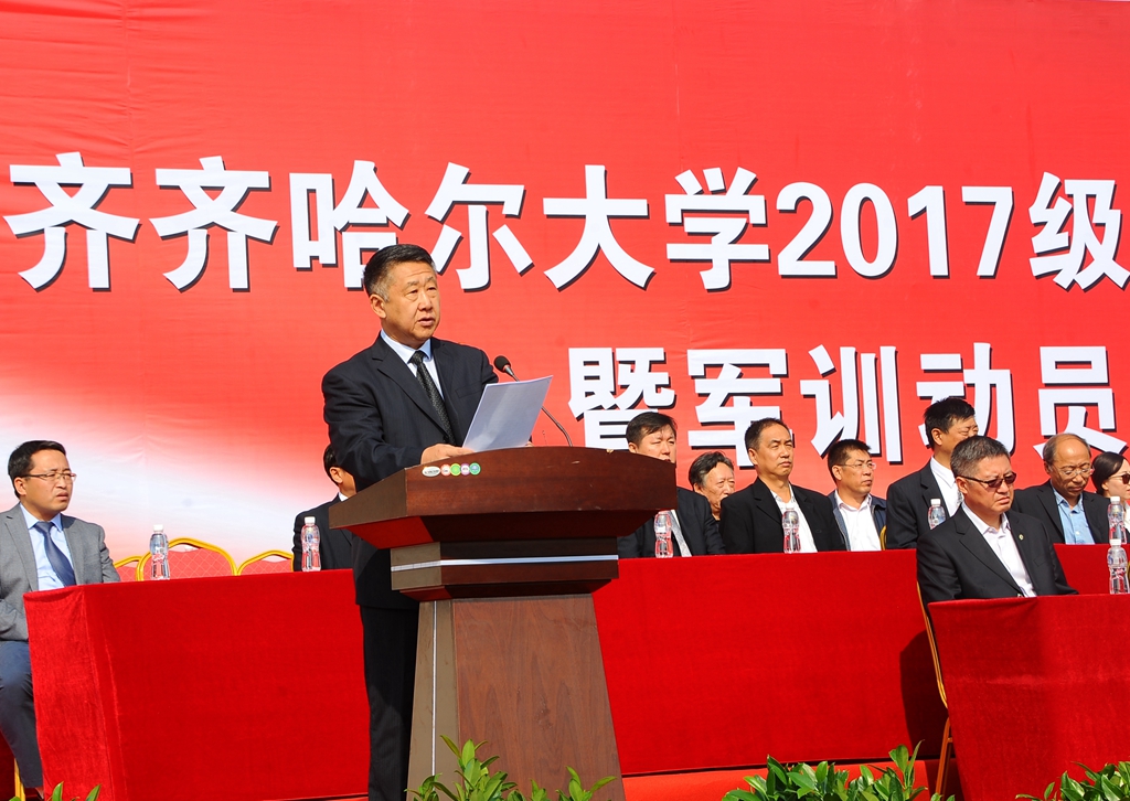 校長馬立群在大會上講話。他說,今天,我們在這里隆重舉行2017級新生開學典禮暨軍訓動員大會。我代表學校,對成功考入齊齊哈爾大學的本科生、研究生表示熱烈的祝賀和誠摯的歡迎!向一路支持你們成長成才、付出辛勤汗水的父母、老師們表示深深的敬意!