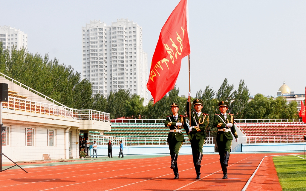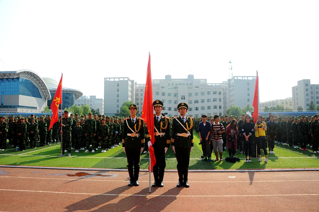 學生代表迎“齊齊哈爾大學軍訓團團旗”