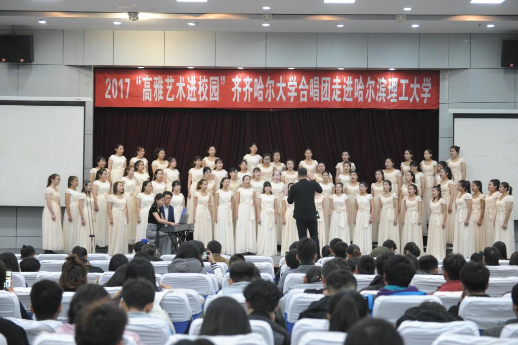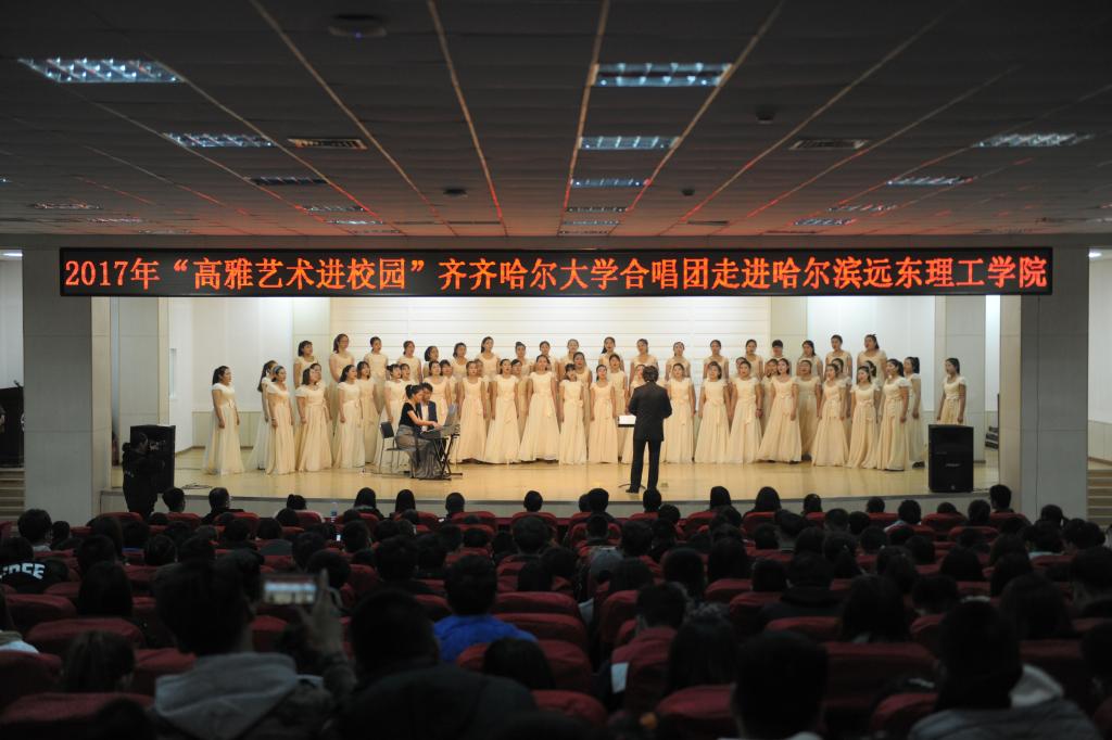 在中國共產黨第十九次全國代表大會召開之際,為傳承和弘揚高雅藝術,10月20—23日,受黑龍江省教育廳、文化廳、財政廳的指派,齊齊哈爾大學音樂與舞蹈學院院長孫相根,校黨委宣傳統(tǒng)戰(zhàn)部副部長何強,音樂與舞蹈學院管弦系主任郭旭,帶領齊齊哈爾大學合唱團70余名師生,赴哈爾濱遠東理工學院、哈爾濱理工大學、大慶醫(yī)學高等??茖W校、黑龍江八一農墾大學、大慶職業(yè)學院開展了五場“高雅藝術進校園”專場演出。