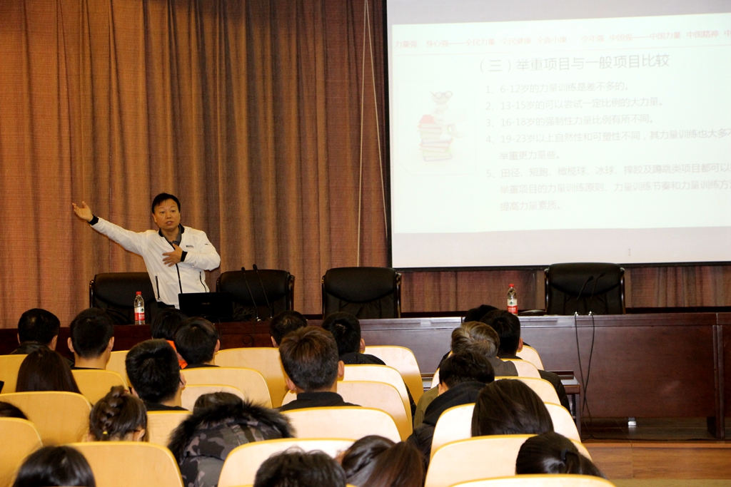 4日上午,錢光鑑在德潤(rùn)大廈四樓會(huì)議室為我校師生作了題為《青少年科學(xué)化力量訓(xùn)練》的學(xué)術(shù)報(bào)告,提出了“全民力量健身”、“力量健康”、“力量防治傷病”、“力量時(shí)尚”、“力量時(shí)代”、“力量創(chuàng)新”、“力量研發(fā)”及“人體力量學(xué)”等一系列極具前瞻性的“力量理論”。報(bào)告語言風(fēng)趣、思想深刻、內(nèi)容豐富,讓與會(huì)師生開闊了視野,深受啟發(fā)。臺(tái)上臺(tái)下師生互動(dòng)熱烈,博得陣陣掌聲。