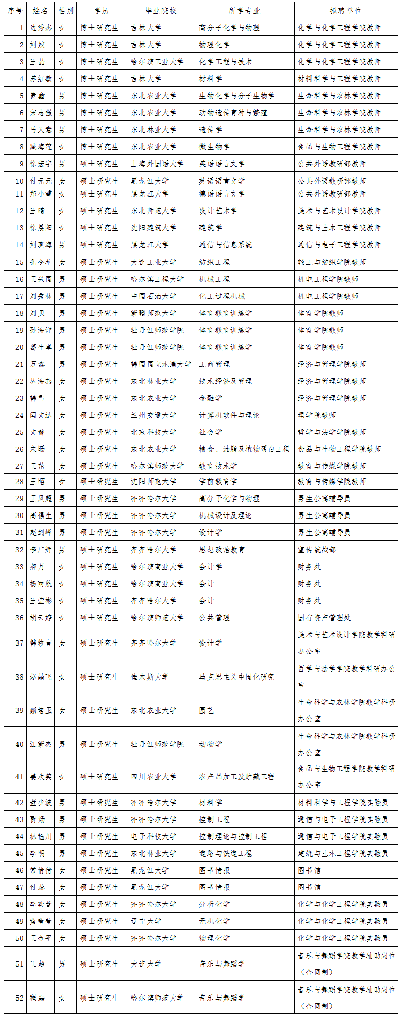 按照《黑龍江省事業(yè)單位公開招聘工作人員實施細則》的規(guī)定,根據(jù)《齊齊哈爾大學2017年上半年公開招聘人員公告》明確的原則、程序和方法,現(xiàn)將擬聘用人員予以公示。如對公示人員有異議,可在公示期內(nèi)反映,反映情況和問題必須實事求是,應(yīng)簽署或告知真實姓名、工作單位和聯(lián)系方式;對線索不清的匿名信和匿名電話,公示期間不予受理。