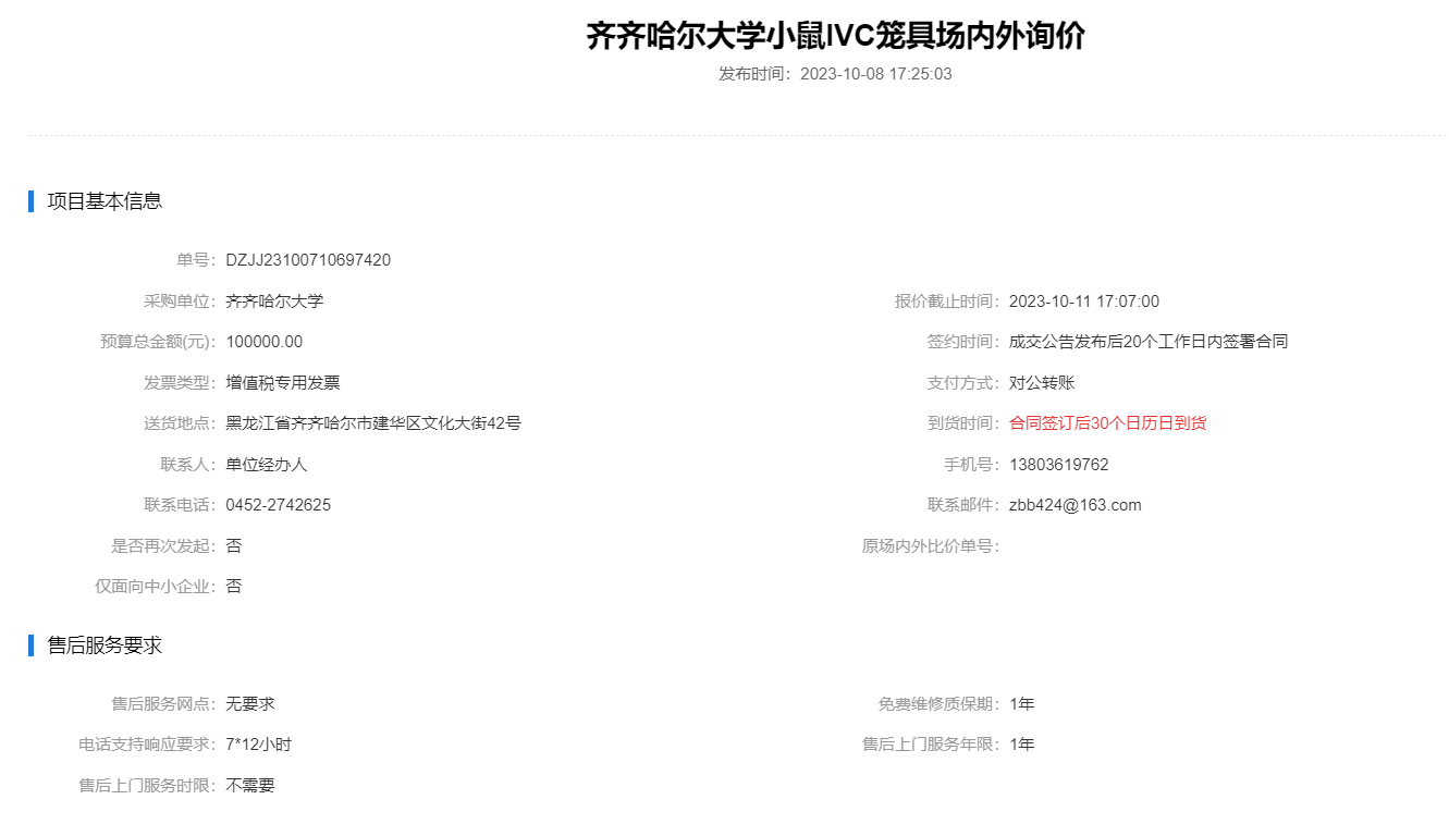 上一條:齊齊哈爾大學小鼠IVC籠具場內外詢價(二次)(轉自黑龍江省政府采購網)